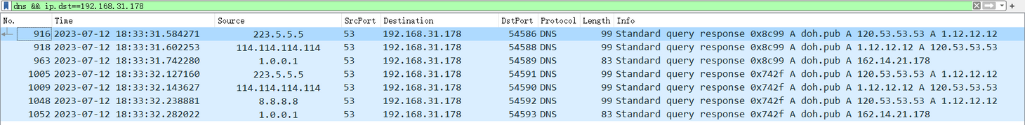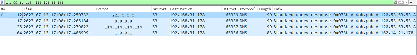 具体来说 ,我们在对照组(默认配置)下使用 DOH https://doh.pub/dns-query 发送域名解析请求,这个请求是一个封装在 HTTPS 数据包中的加密申请,我们无法在过滤条件为