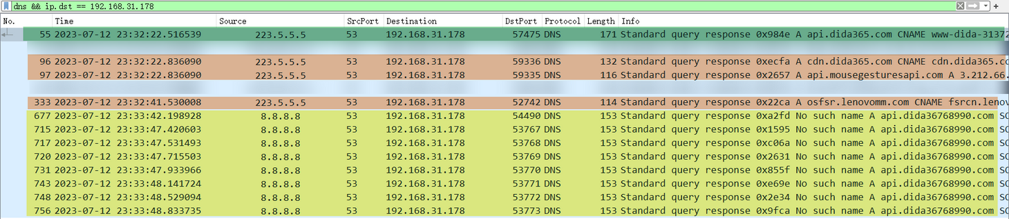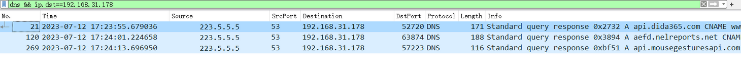 api.dida365.com,还能看到其他驻台程序发起的 DNS 请求。显然,这与对照组的结果不一致。