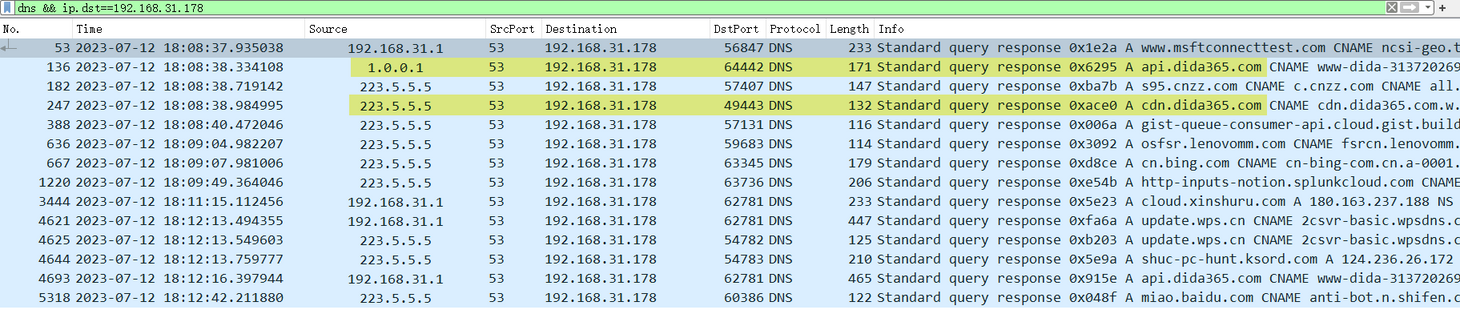 api.dida365.com的 DNS 请求被加密成 HTTPS,在 dns 筛选中不显示。其他的 DNS 请求都走 nameserver ,结果同上一则实验一致。