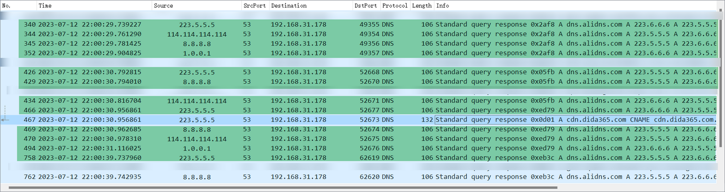 当我们等待一段时间后,我们可以陆续收到来自系统DNS(网关)返回的 DNS 查询响应。按理说,我们的请求不是被加密了吗?要响应也应该是 HTTPS 类型的协议,再不济也应该是阿里服务器返回的响应啊?(也即