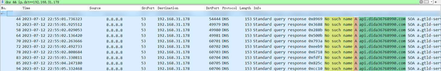 DOH 行进时,域名查询被封装在 HTTPS 请求中,使其本质上成为了 HTTP 协议类型的加密流量。这种类型的请求无法使用 protocol==dns 进行捕获,如 wireshark 的截图所示,看不到查询 api.dida365.com 的响应纪录。