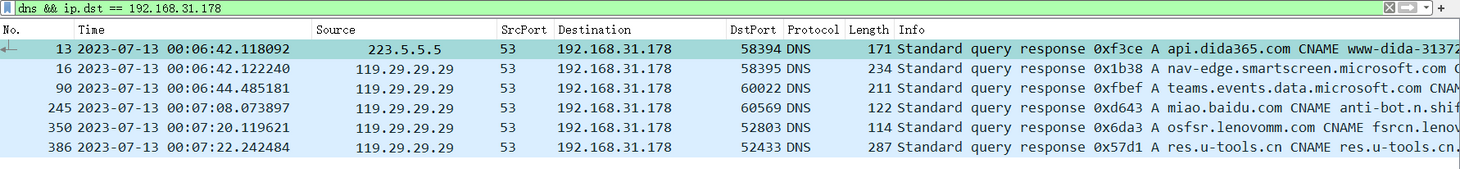 api.dida365.com的 DNS 请求被加密成 HTTPS,在 dns 筛选中不显示。除此之外所有的 DNS 请求都走 119.29.29.29,比如随后响应的