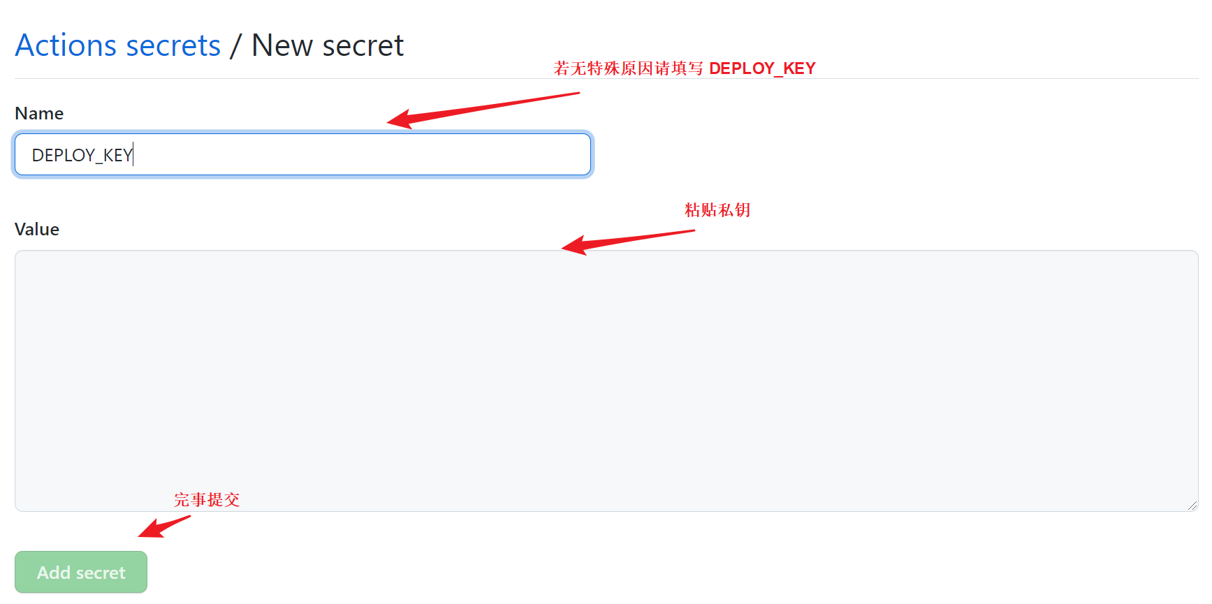 id_rsa,复制其内容,打开 私有仓库 也即 源码库 ,Settings – Secrets – New repository secret 添加仓库密钥(给予工作流中被临时分发的虚拟机操作你的某个仓库的权限)。